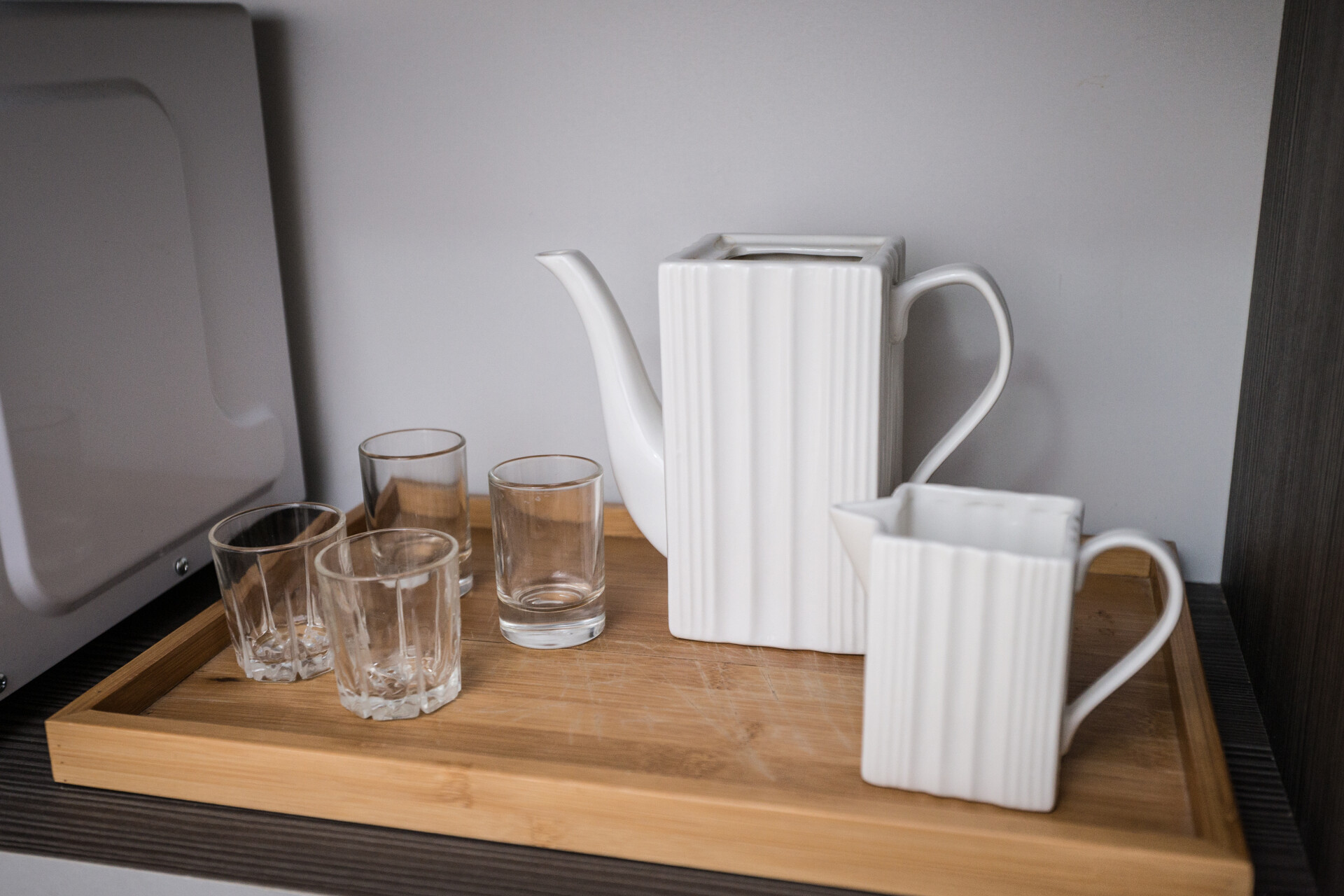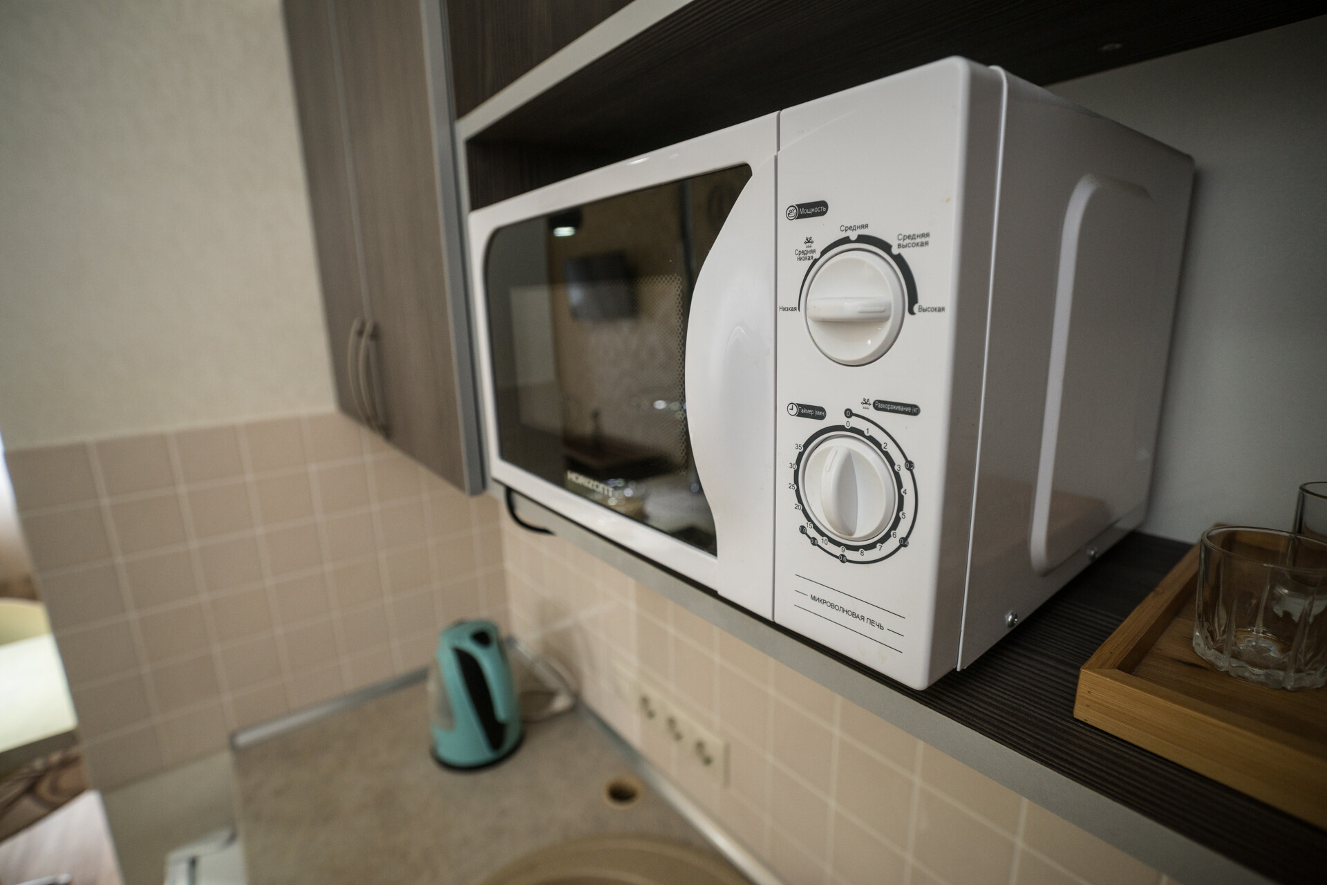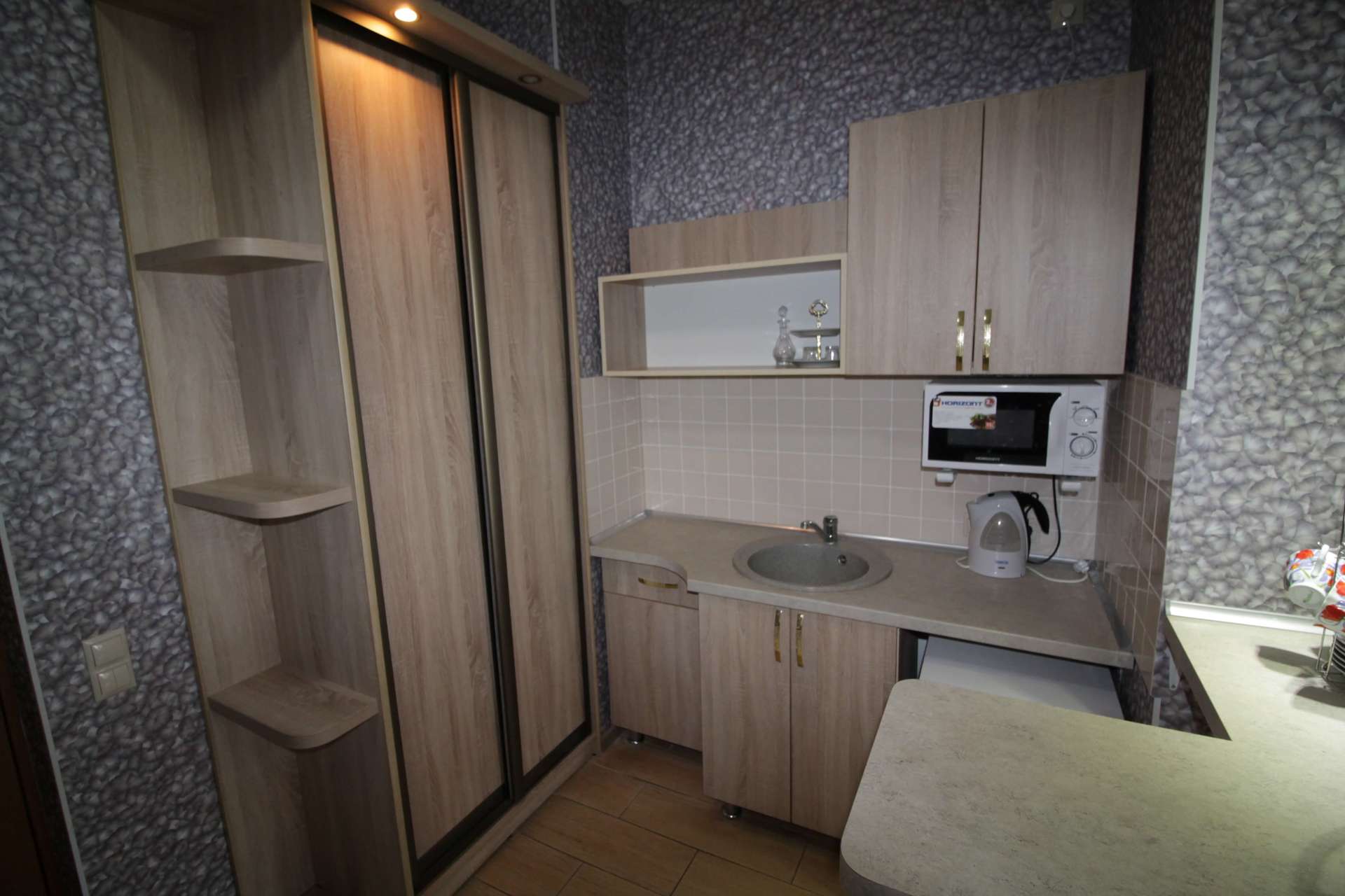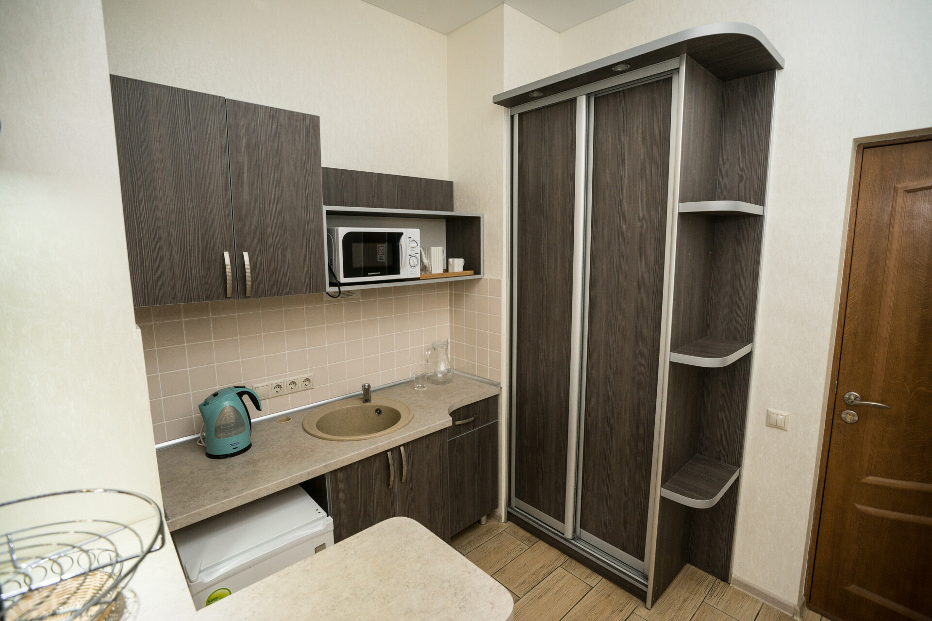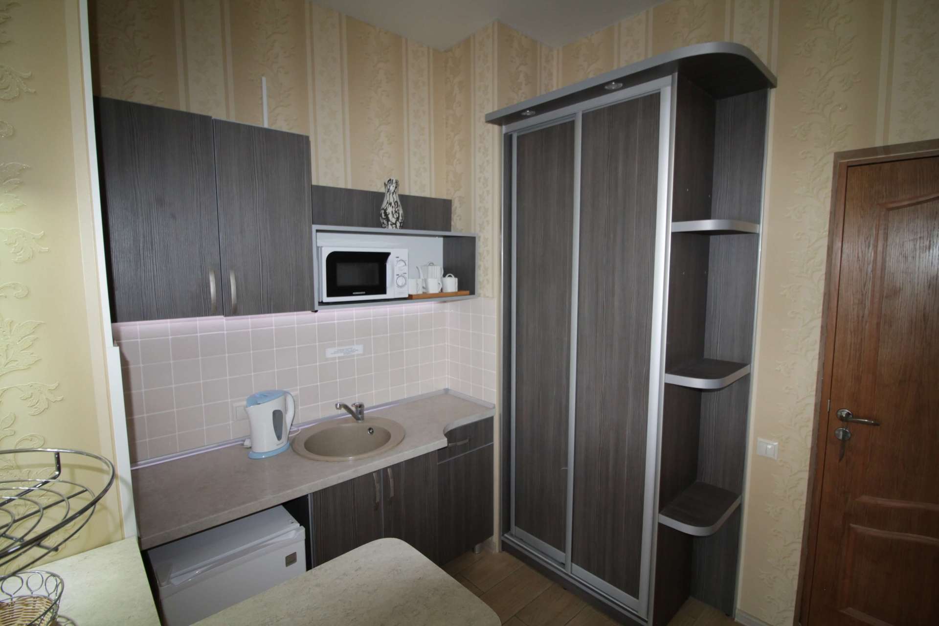 Мини-кухня: набор посуды, электрочайник, холодильник, микроволновая печь, барная стойка.