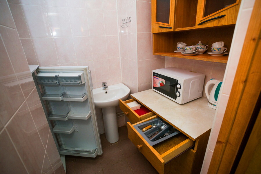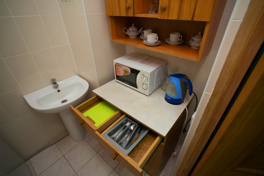 Мини-кухня: набор посуды, электрочайник, холодильник, микроволновая печь.