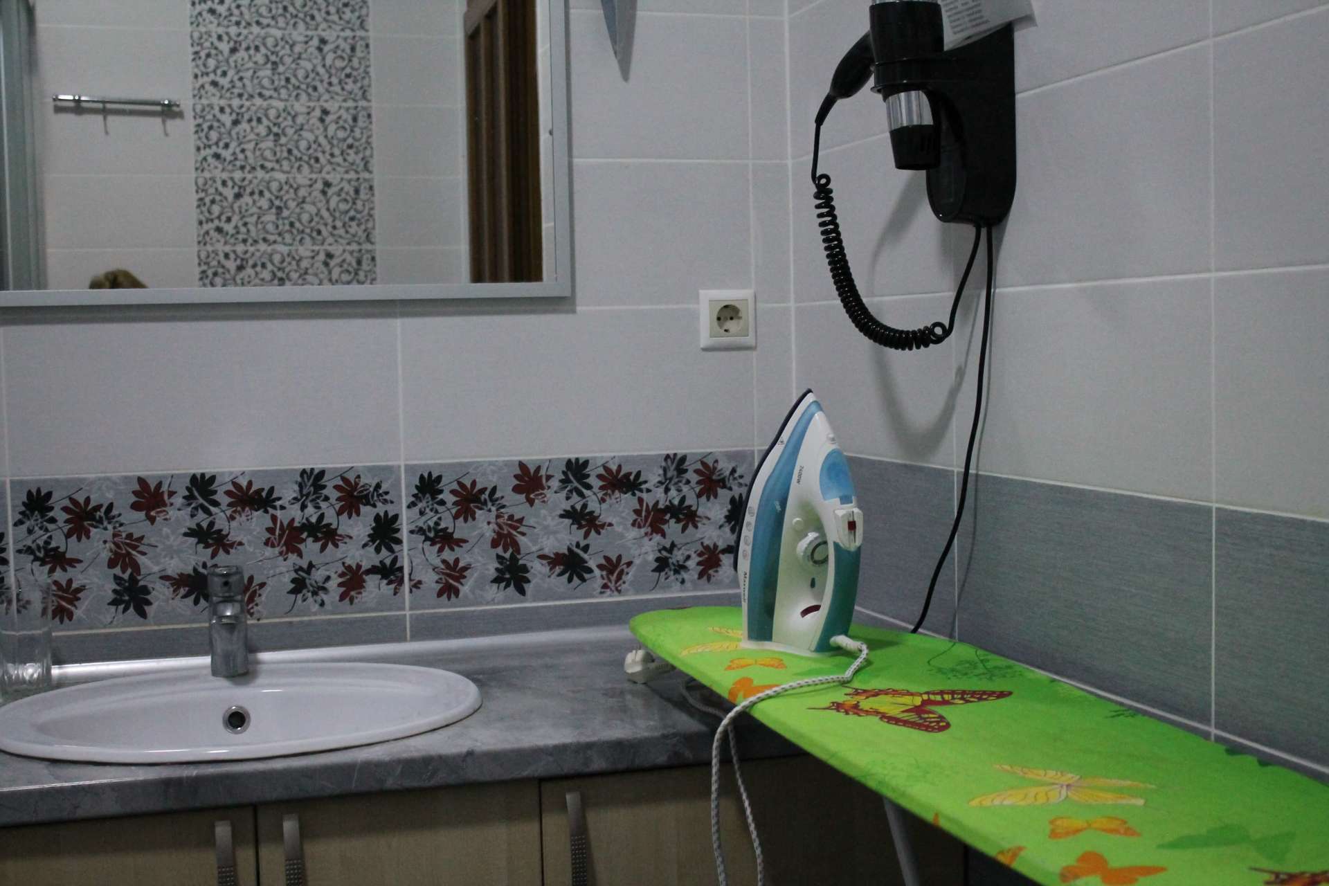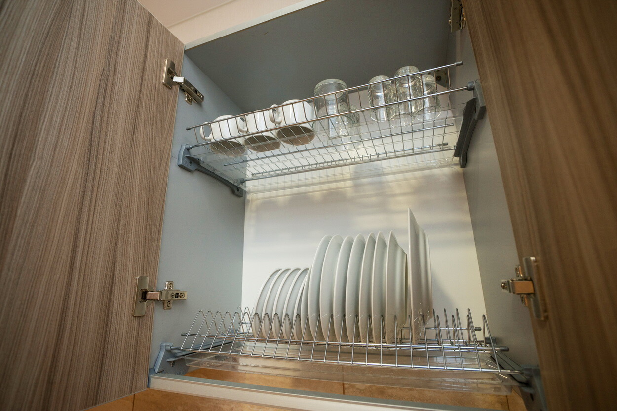 Мини-кухня: набор посуды, электрочайник, холодильник, микроволновая печь, гладильная доска, утюг.